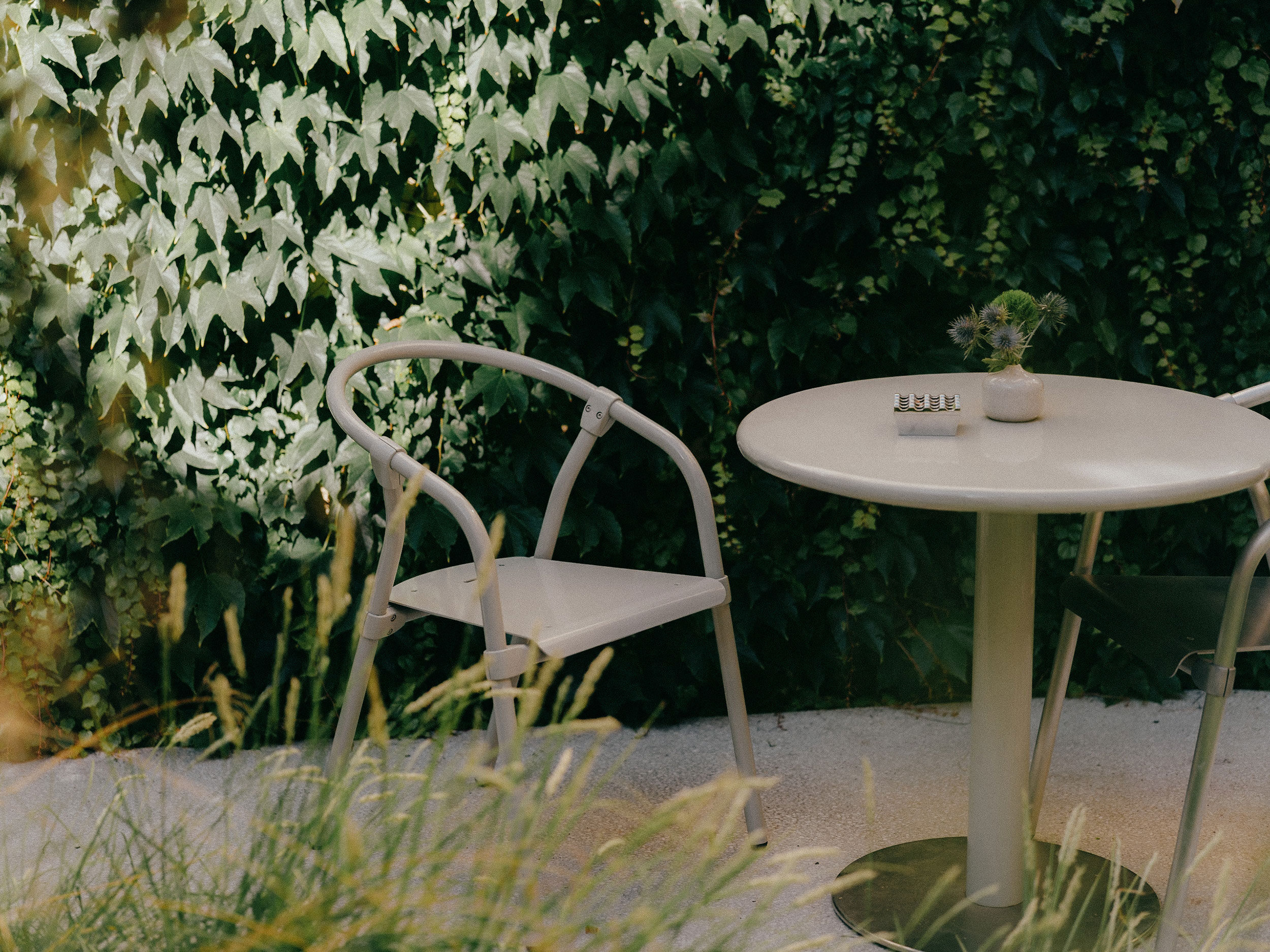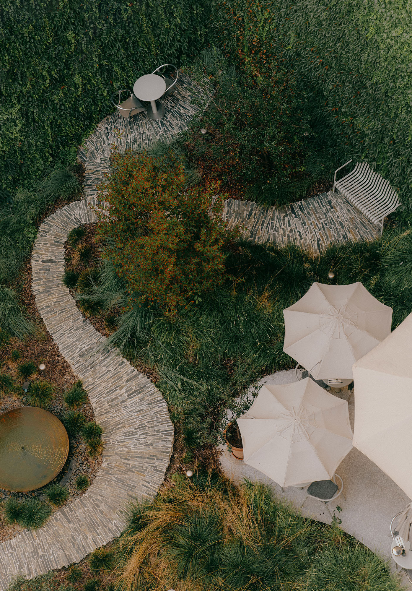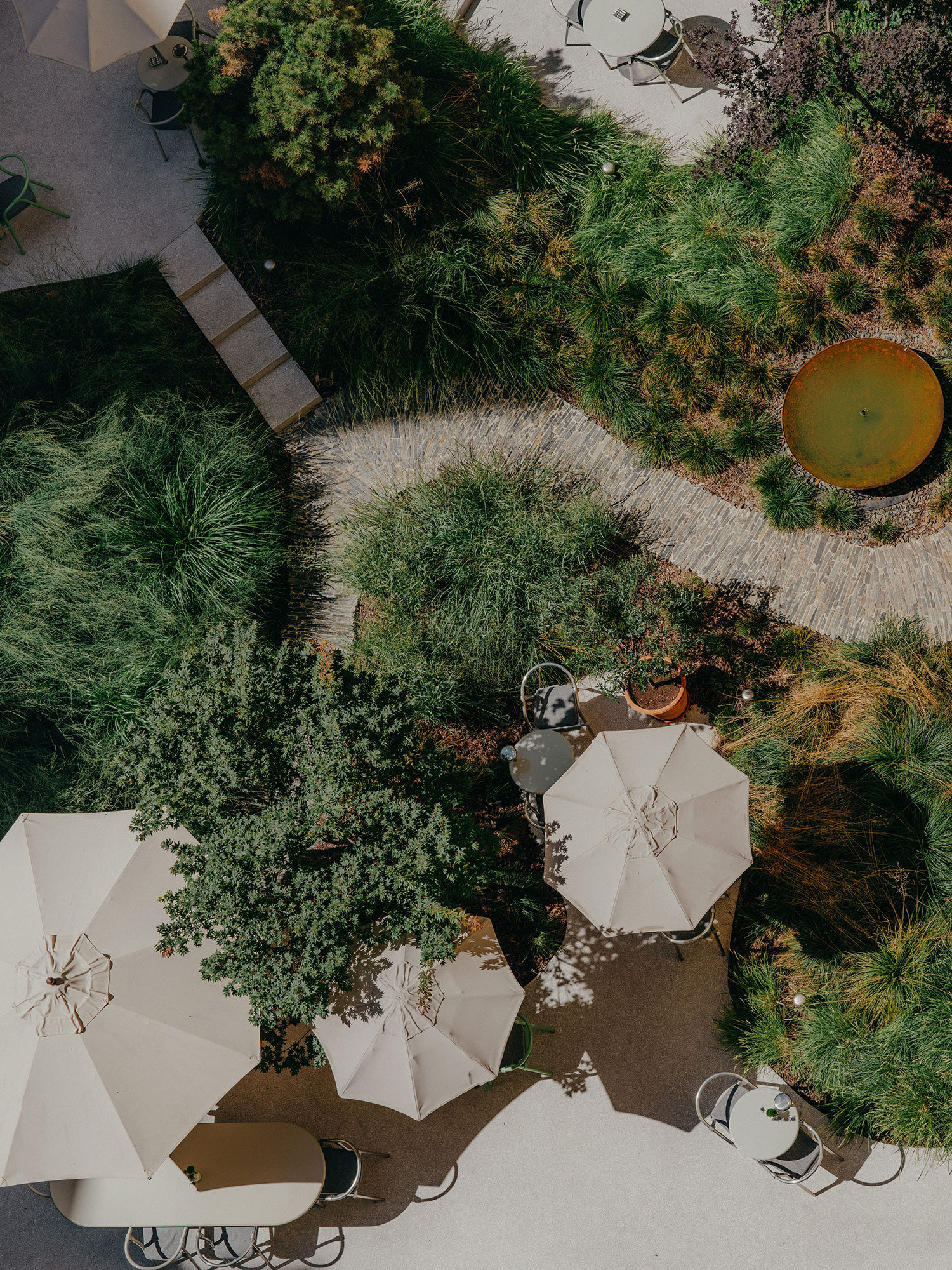 Our garden has been newly reimagined with the same attention to detail as our interiors. What was once a flat courtyard is now a playful composition of levels and platforms, with seating spread among grass and trees. A winding cobbled path connects them all, guiding you through shaded corners, sunlit benches, and quiet spots perfect for an early espresso or an afternoon aperitivo.