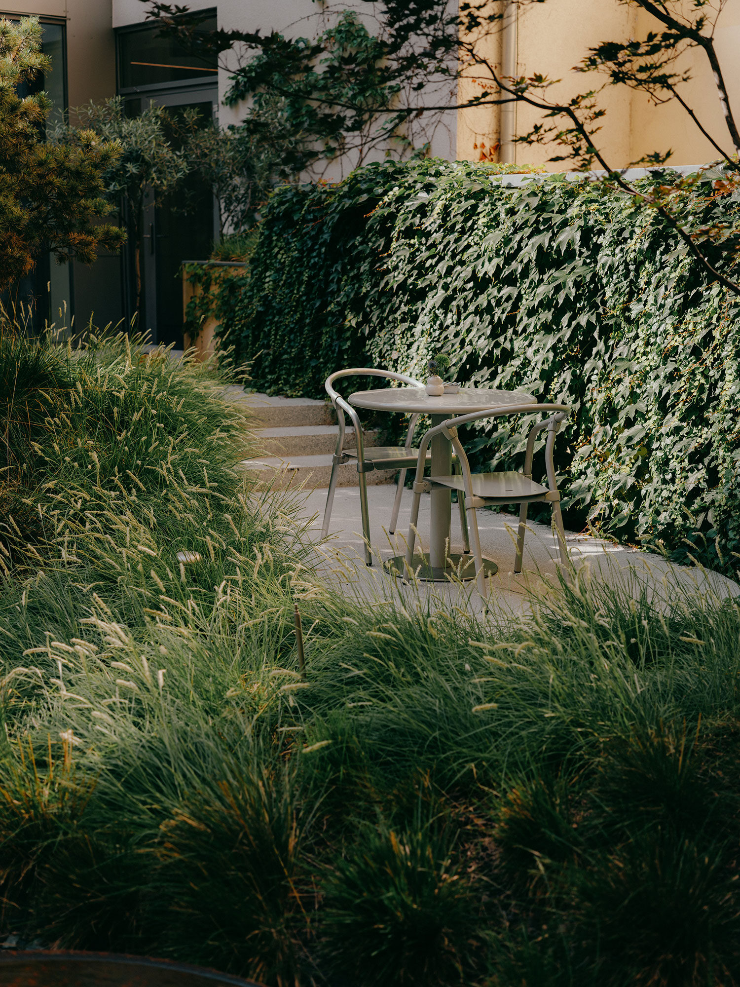 The garden is softened by wild grasses that shift with the air, offering both privacy and constant movement. The garden changes as the seasons turn — light shifts, leaves transform, grasses sway — always alive, always in motion.