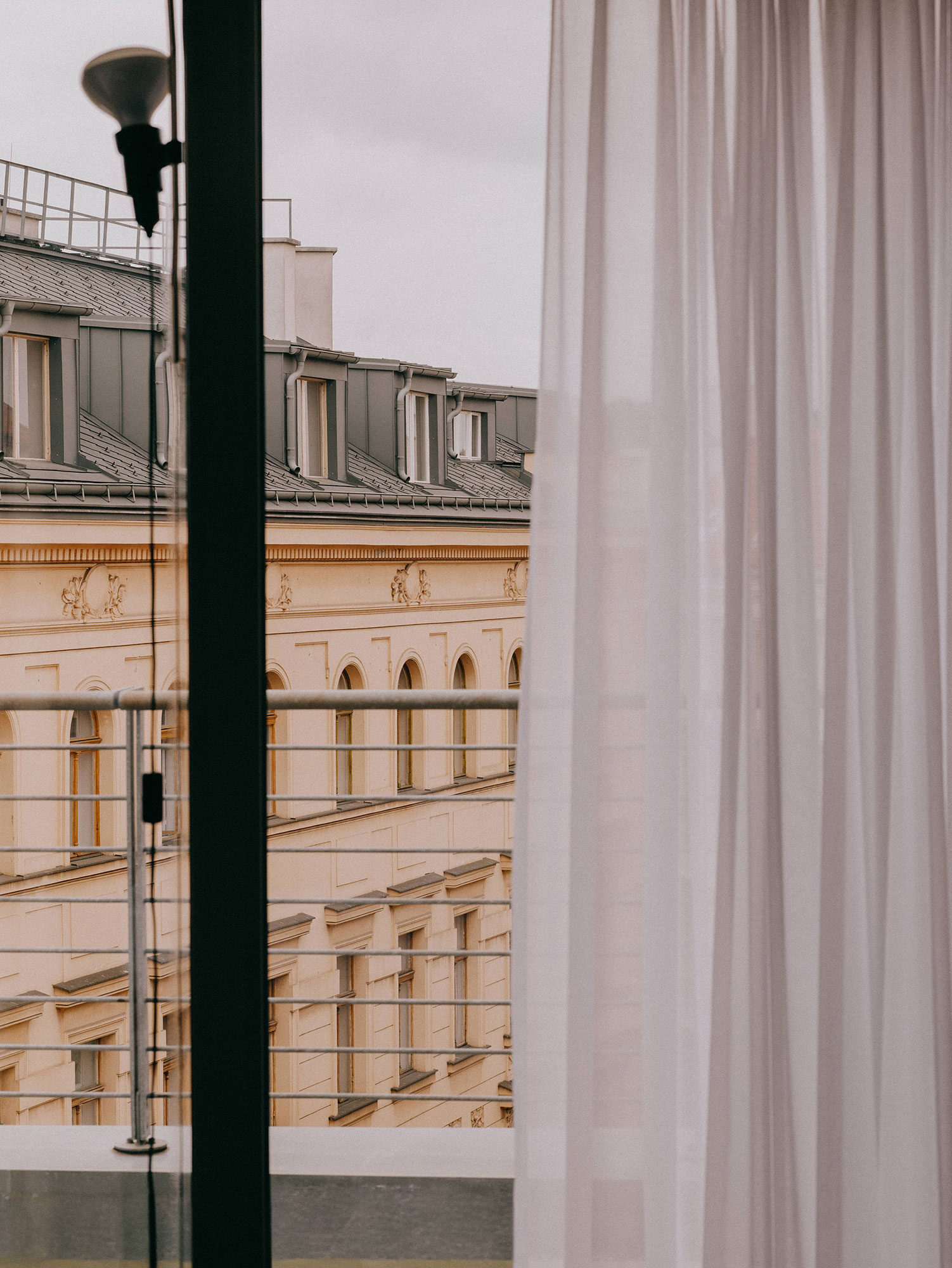 Floor-to-ceiling windows and a private balcony frame the city in light, morning to evening.