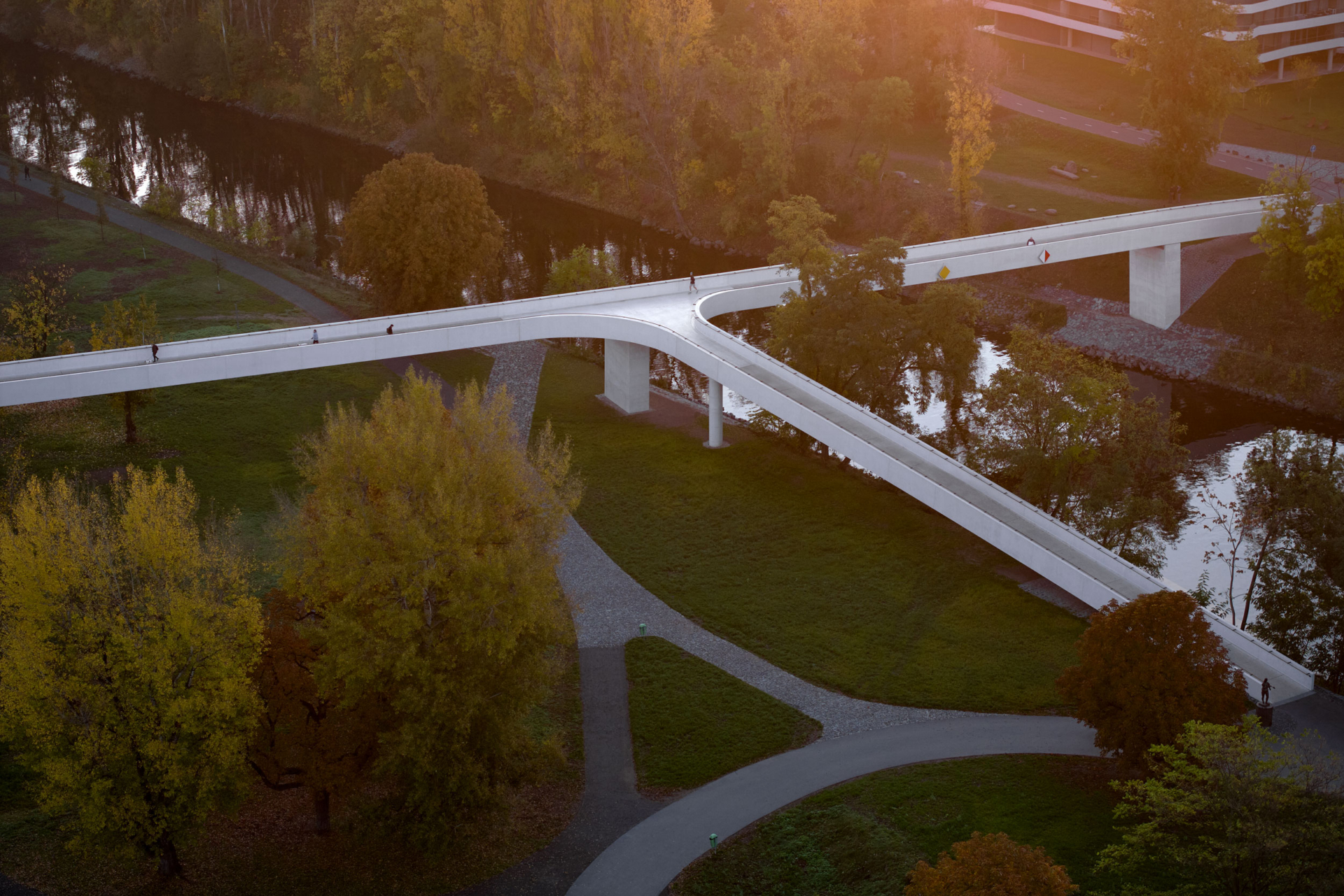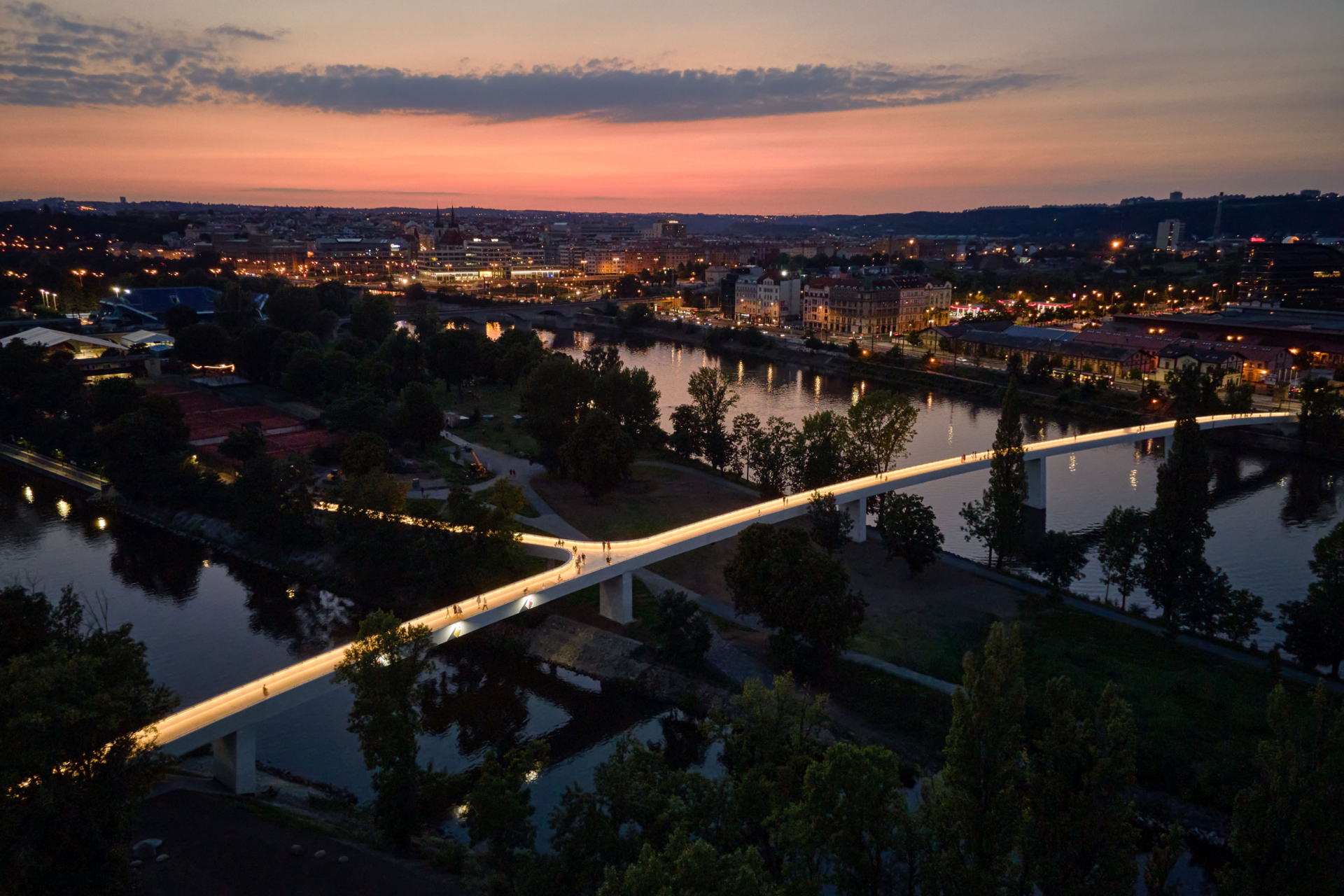 The Štvanice footbridge connects the neighborhoods of Karlín and Holešovice, spanning both a river and the gap between two worlds — Karlín’s corporate offices and upscale gastronomy on one side, and Holešovice’s repurposed factories, transformed into cafes and art galleries, on the other. Nicknamed HolKa, the smooth, simple lines blend into the city’s skyline without disrupting it. An off ramp gives access to Štvanice island, popular for picnics or drinks in the summer. Designed by Petr Tej, Marek Blank, and Jan Mourek.